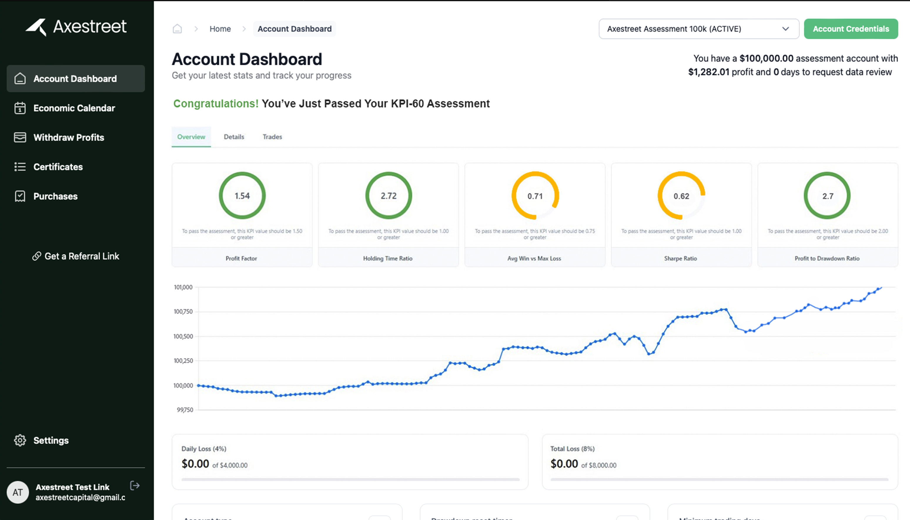 We recognize true trading skill through a comprehensive assessment of risk-adjusted performance. Instead of focusing solely on profit targets, we assess consistency, risk management, and overall strategy execution—ensuring that skilled, disciplined traders have the opportunity to become partners and advance their trading careers.